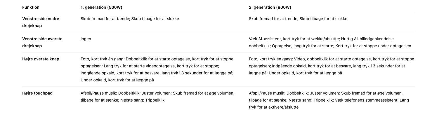 2. generation AI Smart Briller: Hold knappen over venstre tempel nede for at starte optagelsen. Tryk igen for at stoppe optagelsen.